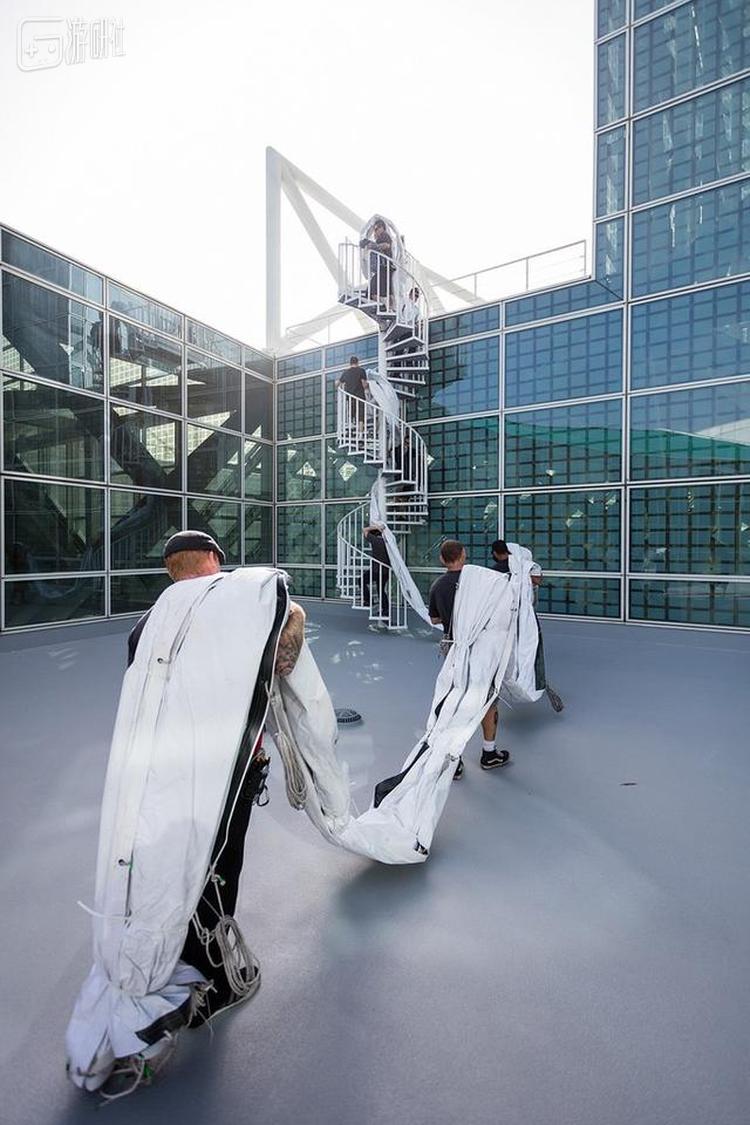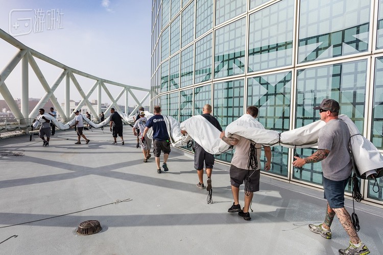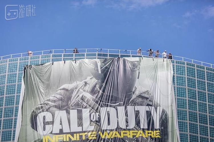 这张使命召唤13的外壁主视觉海报足有625平方米,被挂在60米高的楼外。工作人员正在楼顶做着准备工作,他们都属于GES——一家美国著名的会展公司。