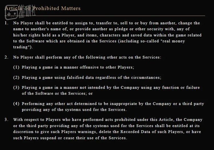 尽管这看上去是明码标价你情我愿的交易,但游戏发行商万代南梦宫为游戏制定的服务条例中明确提到,“任何玩家都无权向其他玩家出售或购买其作为玩家所拥有的所有权利”,换言之,不论是购买还是出售卢恩,都面临着账号封禁的风险。