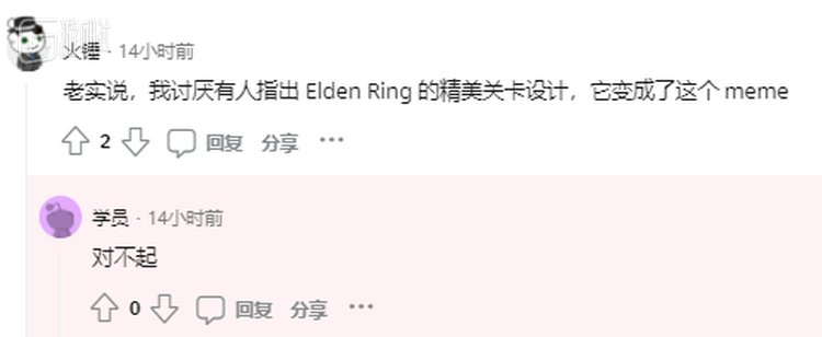 网友们的乐子在于,原作者好像并不清楚给玩家适当的引导是一个游戏的基本设计概念。他感到老头环的设计优秀没错,只是他的解释让人听起来像有人在跟你说:“你想喝水,那是因为你渴了”。