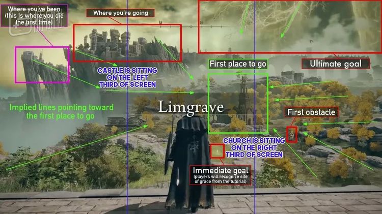 图片里展示的是玩家站在宁姆格福时见到的景象。帖子的作者则试图通过给重要地点、敌人打上箭头和方框的方式,向其他玩家们说明From Software早就已经给你埋下了足够的视觉线索和引导。