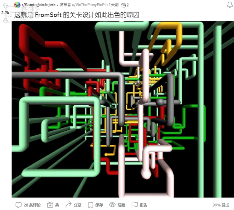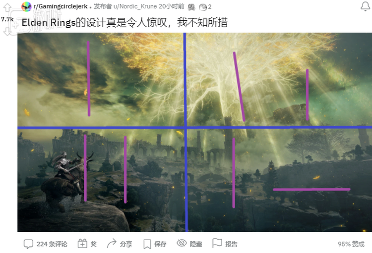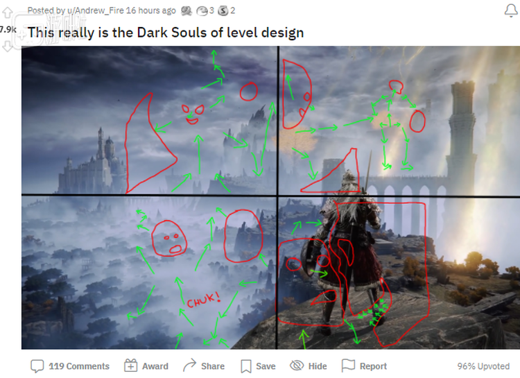 3月10日,在Reddit的老头环板块里,有人发表了一条帖子,名为《这就From Software的关卡设计如此出色的原因》。正文内,作者附上了这么一张带有标记的游戏截图: