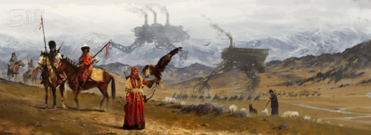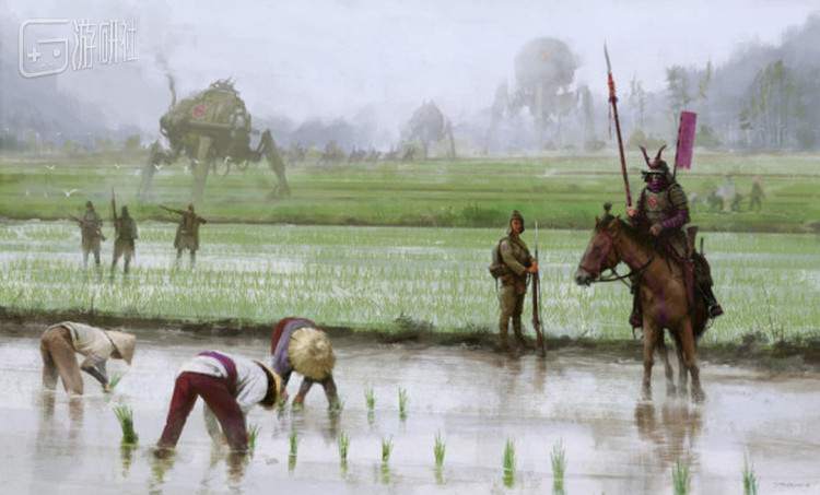农田里辛勤耕作的农夫,扛枪的士兵,骑马的武士,远方缓缓驶过的多足机械兽,如此多不相干的元素出现在一幅图画中,却毫无违和感