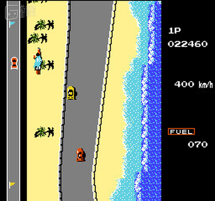 《午夜狂奔》虽然名字里带Road Fighter,但其实跟《火箭车》的设计半毛钱关系也没有。《火箭车》中经典的燃油系统彻底被抛弃,游戏变为了当时街机游戏最流行的跑圈加分段倒计时。