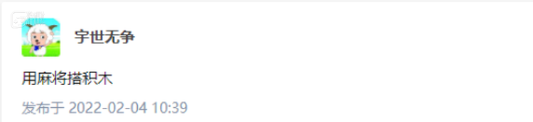 2019年,微博一个名为 “用麻将建房子” 的话题一度流行,网友们纷纷意识到,原来用麻将搭房子属于是刻进人类基因的行为,因此纷纷晒出自己研究多年的杰作,在这个领域里“卷”了起来。