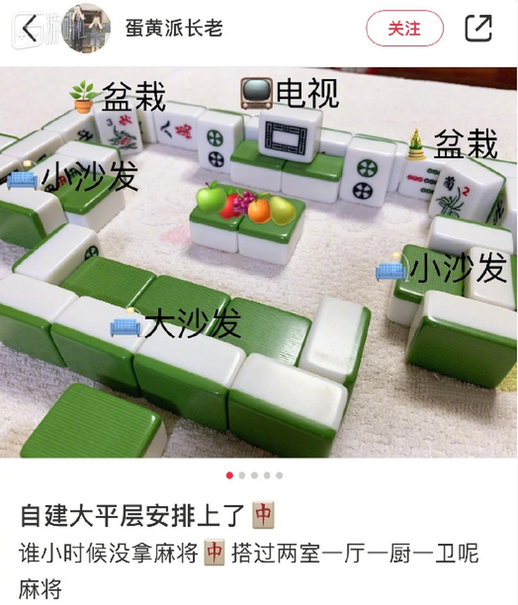 总有人试图用麻将拼出自己理想的“梦中情屋”。而最神奇的是,即便这些方块看起来再抽象,几乎所有人都能一眼认出其中的沙发,电视,床,乃至用“二饼”构成的立体音响。即便半弧形的大阳台没有玻璃也没有阳光,也不能妨碍人们在想象中感受站在大落地窗前享受日光浴的惬意。