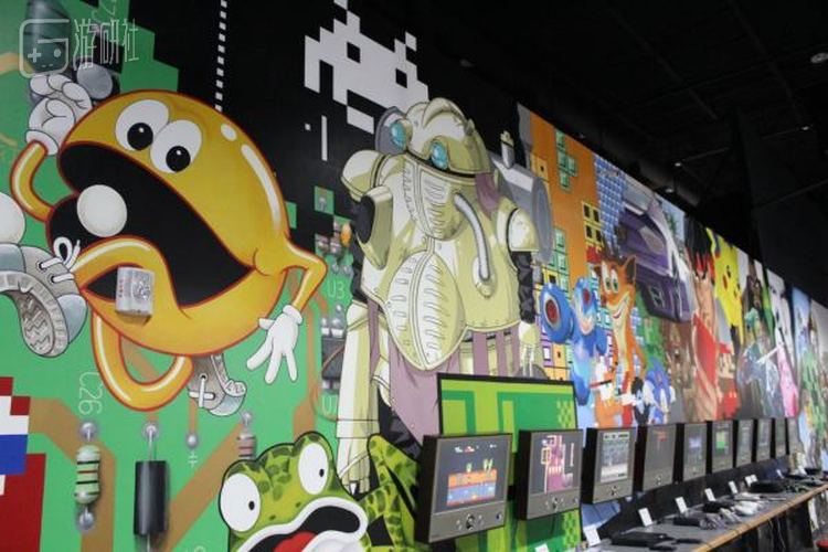 由当地艺术家绘制的巨大壁画,在壁画下方则是一长溜可免费游玩的各式主机。