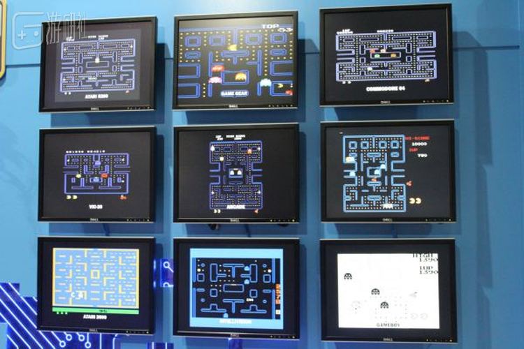 一面电视墙上正在演绎不同版本的吃豆人,据说一些早期的商业广告会用这种方式来比较不同主机的性能。