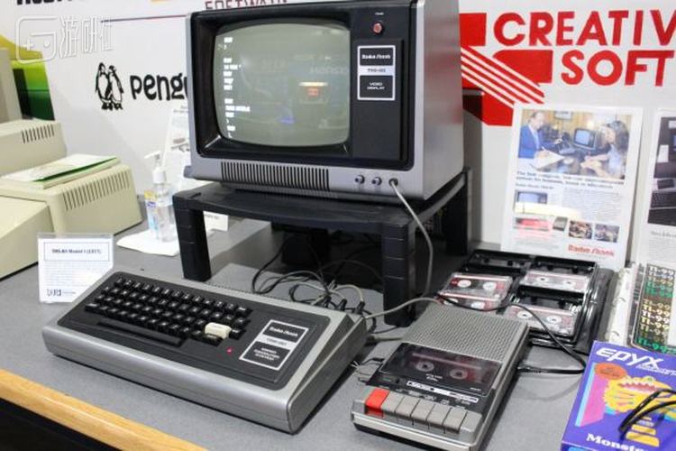 这是一台产自1977年的TRS80 I型电脑,所采用的存储媒体还是磁带机。磁带后面竖放的印刷制品则是当年的广告宣传册。