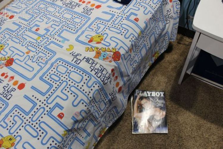 注意床上的床单图案,在床底下还藏有一本花花公子杂志(误),其实封面下面是一本游戏杂志啦。