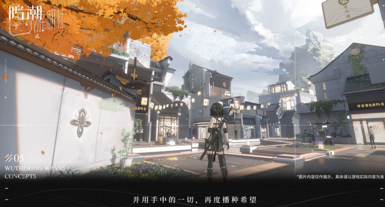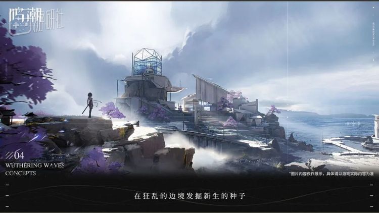 从PV和介绍来看,《鸣潮》的故事发生在一片未来的科技废土,人类刚刚结束了大战,开始重建家园。玩家扮演苏醒的漂泊者,要在这块新时代的新大陆上展开冒险。官网也贴出了几张视觉图,图中一位女性角色持刀凝望着几个不同的场景,有崩解起伏的大地,还有已经覆上青草的废墟,以及科技感十足的城镇。对玩家来说,这就是暗示“以后这些地方你们都可以去”(今天发布的实机视频也部分印证了这点)——开放世界游戏最有魅力的地方正在于此。