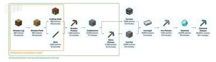至于同行们费尽心血钻研的挖钻石的方法,OpenAI也通过强化学习构建了一套科学合理的计算机模型。从获取木头开始,到在工作台上做出一把钻石镐,总计需要24000次操作,对于较为熟练的老玩家来说,完成这套流程的时长大概在20分钟左右,而如今的AI在经历了大规模训练过后,收集钻石的效率足以比肩人类。