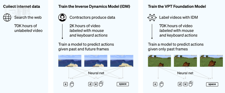 为了让AI真正做到像人类一样“玩游戏”,OpenAI的研究人员引入了一种新颖且便捷的AI训练法:视频预训练(Video PreTraining)。他们通过从相关合作方处获取《我的世界》演示视频以及与视频配套的键盘鼠标操作记录,并根据这些操作习惯建立逆动力学模型(inverse dynamics model)以推测模拟视频内的键鼠操作逻辑,此后再反复推演全世界的《我的世界》视频以模拟人类的游玩习惯。