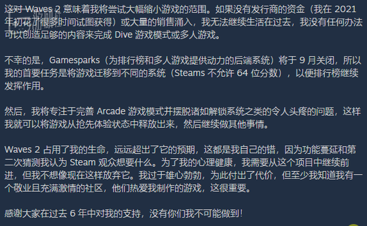 8月6日,国区原定价不过二三十块钱的《Waves》与《Waves 2》,突然变成了免费游戏。8月14日,游戏发布了一篇题为“最终更新”的日志,揭示了游戏免费的原因。日志作者署名CJ,是罗伯的合作伙伴之一,曾参与过《Waves》最早的众筹企划。他在日志中宣读了一则令人悲痛的消息: