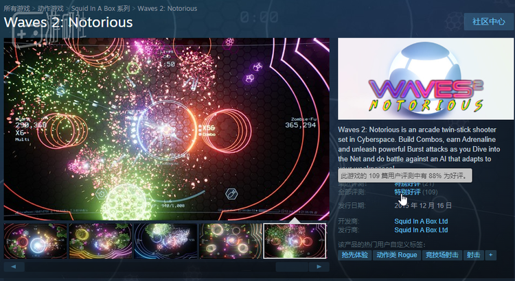 《Waves》与《Waves 2:Notorious》是Squid In A Box开发组打造的双摇杆弹幕射击游戏。游戏内容好理解且易上手,玩家只需操控一个小球,射爆电子空间中任何会动的几何物体,同时躲避这些物体制造的弹幕,途中还能升级技能、收集道具,强化自身的火力与生存性。