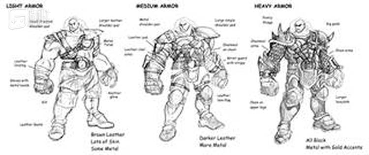 玩家角色有三种不同盔甲,分别为轻、中、重。系统将其混搭以提供更多个性化的角色形象。艺术设计师首先在纸上绘制出野蛮人形象的“纸娃娃”,然后导入Photoshop软件,给其搭配上不同的盔甲