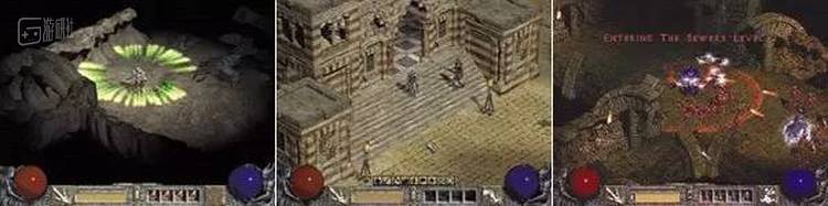一些Act II里的场景:蛆虫巢穴(上),杰海因的王宫(中)和下水道(下)。这些背景元素由3D Studio Max软件创建和渲染,并使用工具将这些渲染文件拼接到“房间”模块中,最后通过游戏引擎将这些房间打造为一个随机生成的环境