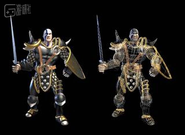 野蛮人角色从草图到多边形模型的转换过程,每个角色的盔甲各部分(头、躯干、腿、双臂、武器和盾牌)都使用内部工具单独渲染而成
