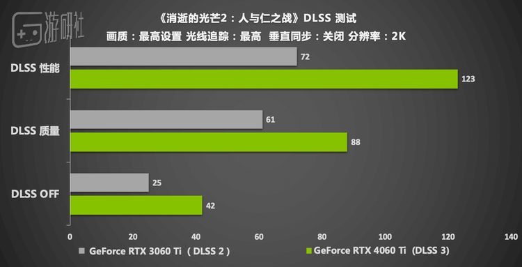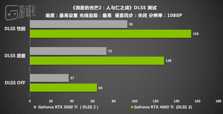 作为一款暴打丧尸游戏,《消逝的光芒2:人与仁之战》在开启DLSS后,对于帧数的提升也很明显,在画质光追全部拉满的情况下,对比1080P与2K两个分辨率,GeForce RTX 4060 Ti相较于GeForce RTX 3060 Ti在DLSS质量下性能提升约75%;在DLSS性能下提升约65%。