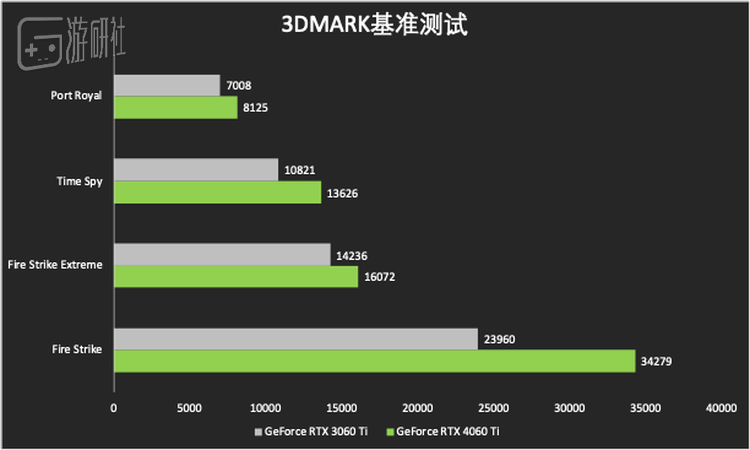 在GPU测试软件3D Mark中,它的几项侧重不同方向的测试里,两代显卡的理论性能差距一目了然。RTX 4060 Ti与RTX 3060 Ti对比结果如图所示:Fire Strike下性能提升约43%;Fire Strike Extreme下性能提升约12.8%;Time Spy下性能提升约25.9%;Port