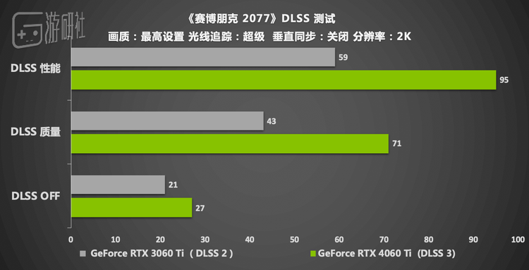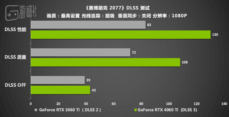 在“硬件杀手”《赛博朋克2077》的1080P与2K两个分辨率下,均将画质以及光线追踪都调节到最高能够看出在开启DLSS后性能具有非常明显的提升。GeForce RTX 4060 Ti相较于GeForce RTX 3060 Ti在DLSS质量下性能提升约61%;在DLSS性能下提升约65.1%。