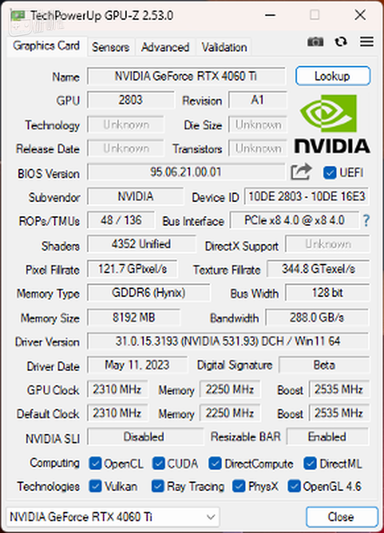 RTX 4060 Ti拥有4352颗CUDA核心、8GB的GDDR6显存。默认频率2310MHz,Boost频率达到了2535MHz。