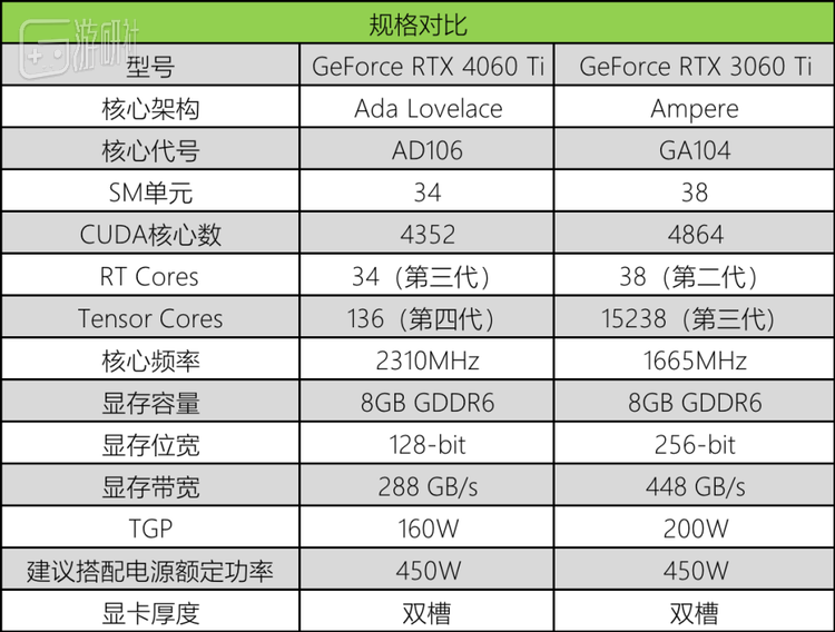 同样清清楚楚的,还有RTX 4060 Ti在规格上的进步,通过下表与RTX 3060 Ti的对比,两代显卡的异同同样一望而知。