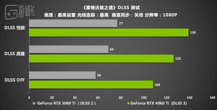 具体的游戏方面,《赛博朋克2077》《霍格沃兹之遗》和《消逝的光芒2:人与仁之战》这三款主流3A大作在1080P分辨率下,它们的画面和帧数表现对比同样能看出RTX 4060 Ti的进步。