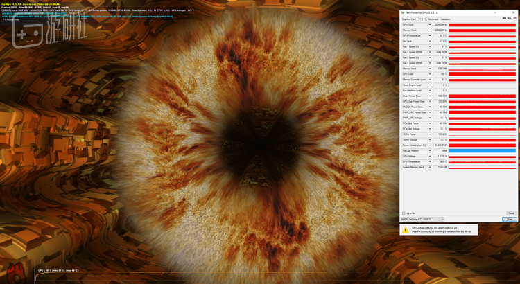 在俗称“甜甜圈”的烤机软件FurMark的测试里,开启FurMark并等待温度和功耗数据稳定后,GeForce RTX 4060 Ti的最高功耗以及温度数据:功耗为143W,温度为67.1°C。