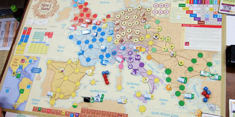 六名玩家扮演16世纪早期欧洲的六大势力,用大量的算子、骰子和卡牌,模拟宗教改革时期的政治、军事、经济与宗教斗争。这就是《教改风云》(Here I Stand),它不算是我最喜欢的桌游,可我总会时不时想起它。